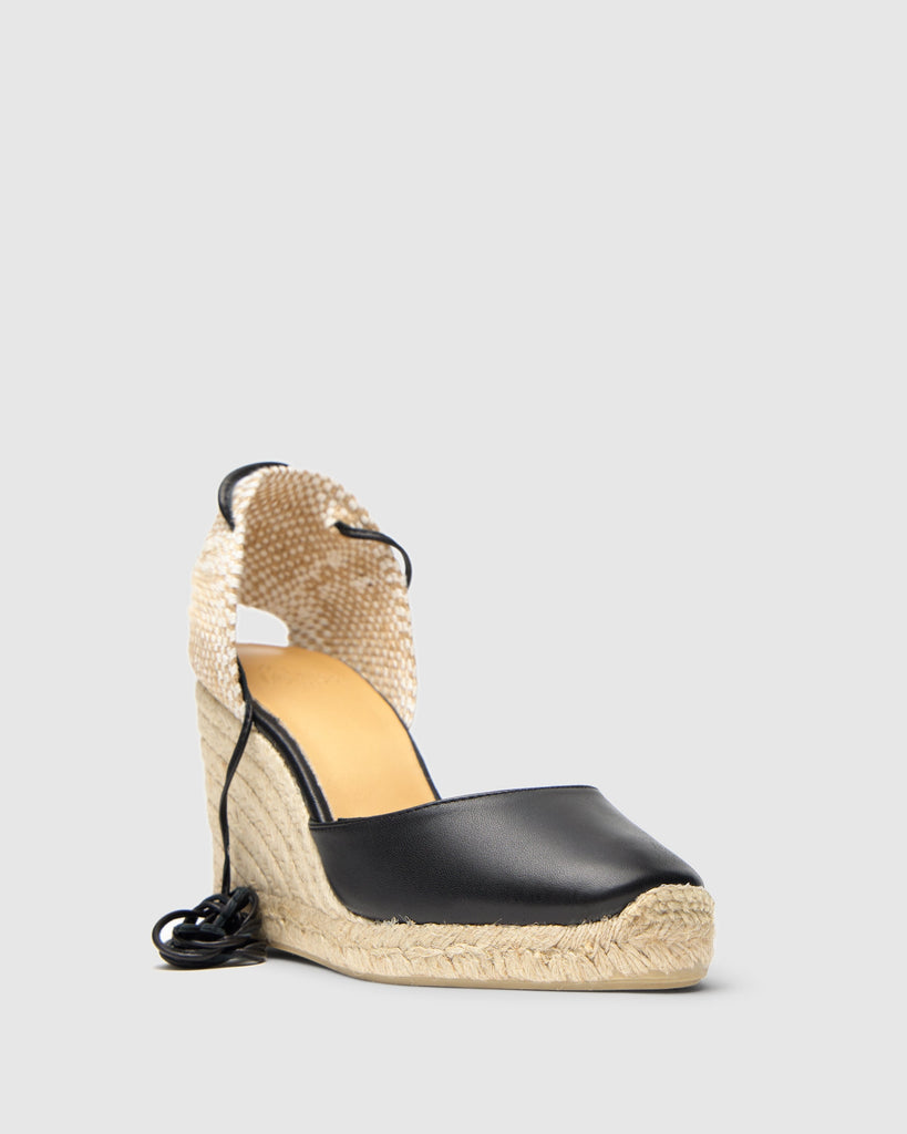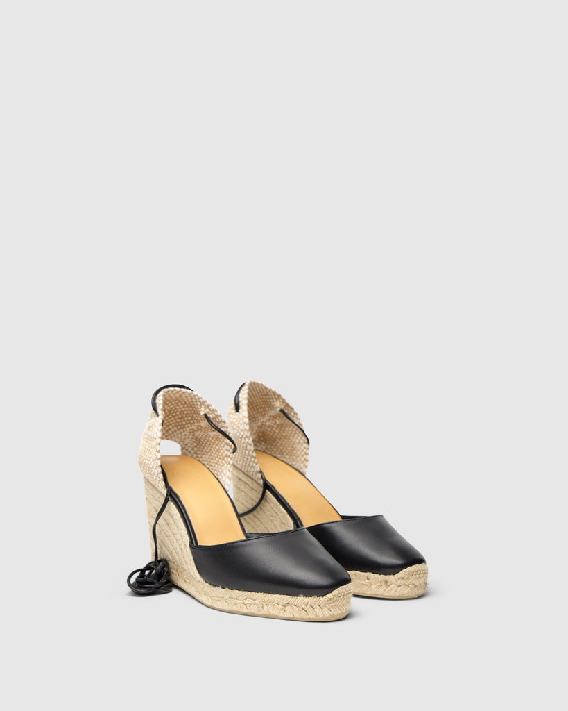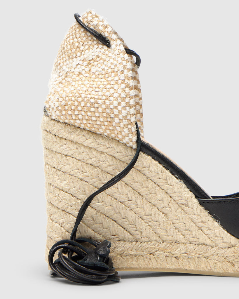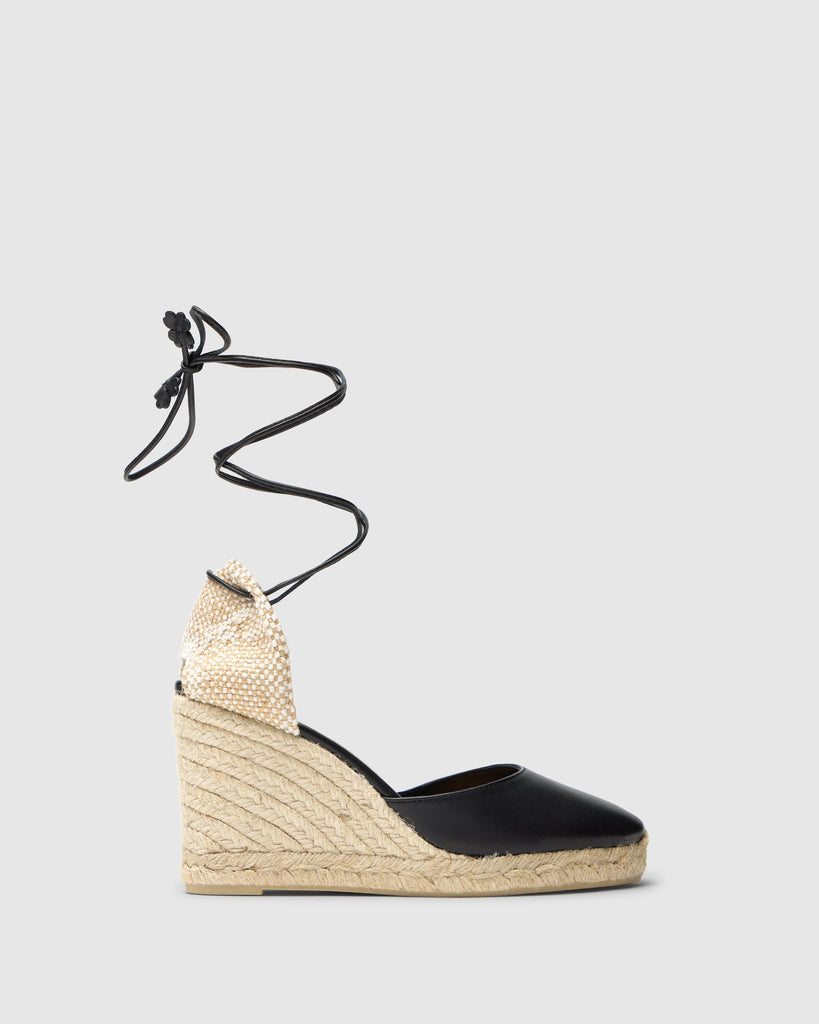 Alpargata Carina en napa con cierre de cordón de cuero, plantilla acolchada y cuña de yute de 9 cm.