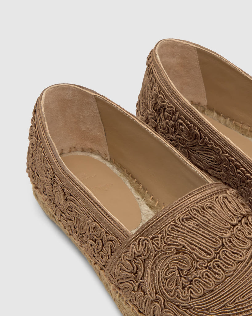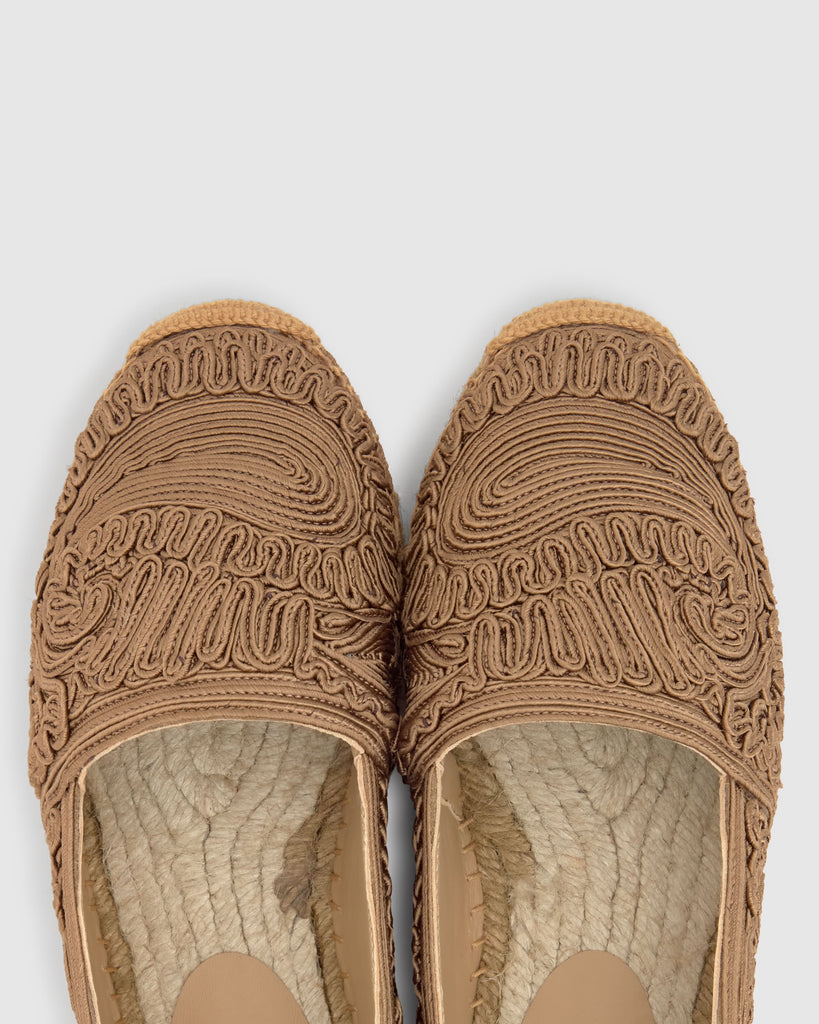 THE ESPADRILLE REVEALS ITS ICONIC SHAPE. THE SOLE IS WORKED ON A WHEEL-SHAPED TABLE THAT SERVES AS A MOLD FOR THE JUTE BRAID. THIS SHAPE IS THE ORIGIN OF THE ORIGINAL ESPADRILLE.