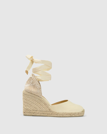 Iconic Carina espadrille in organic cotton with lace-up closure, cushioned insole and 9 cm jute wedge.