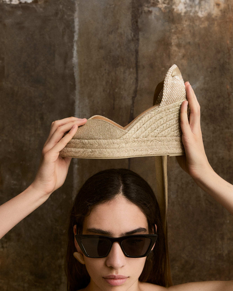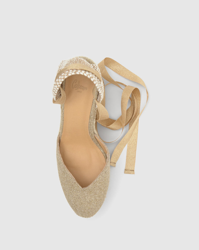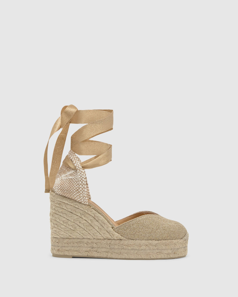 Color: Oro Claro Composición interior: 100% Cuero ovino Composición exterior: 100% Lino Material suela: Caucho Altura total: 11 cm Altura cuña: 8 cm Plataforma: 3 cm SKU: 023196-3004