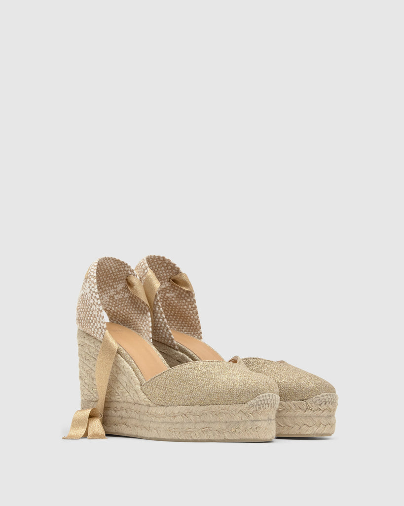 Iconic Chiara espadrille in metallic linen with lace up closure, padded insole and V-neckline. Jute and lurex 11cm wedge with double platform.