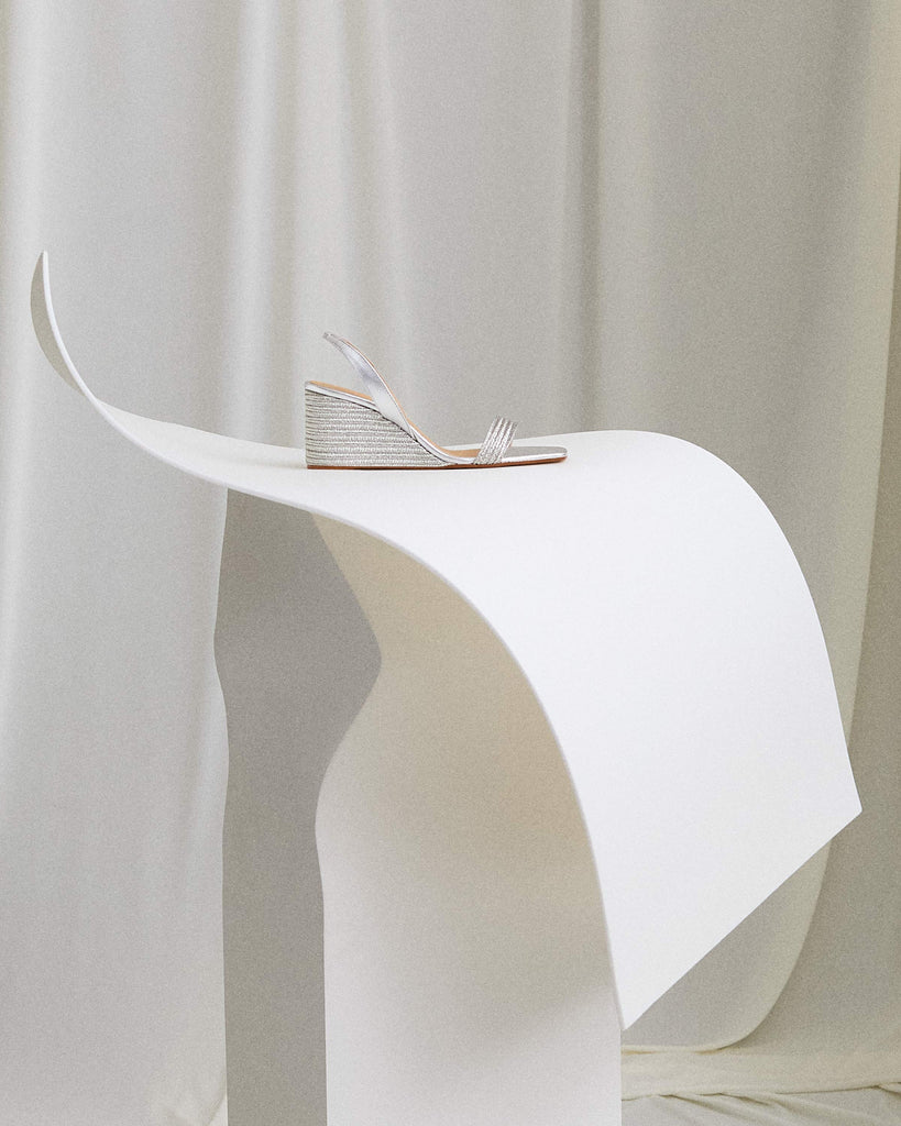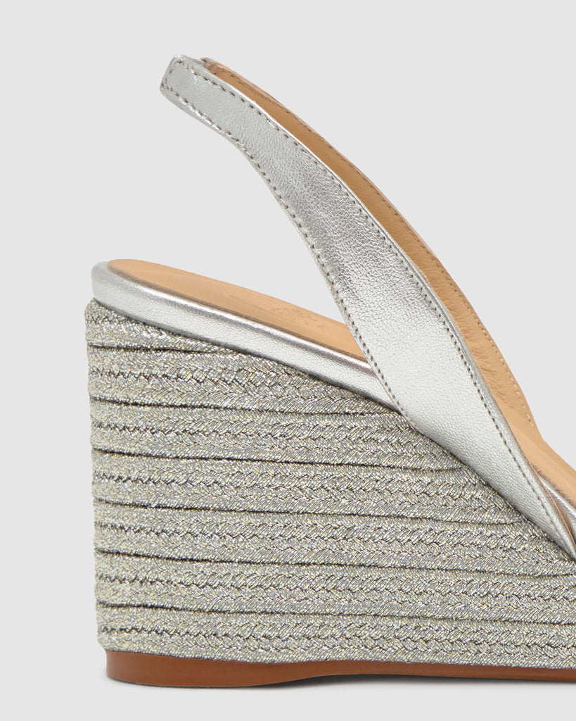 Barby slingback sandal with handmade metallic braiding, cushioned insole and 8cm matching wedge.