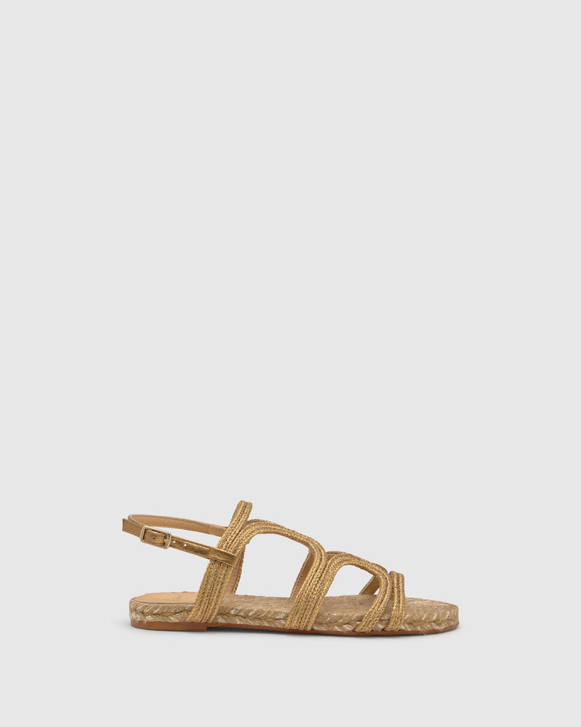 Pitra flat sandal with handmade metallic braiding, buckle closure and jute insole with leather sole.